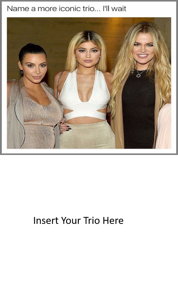 Whoever decided to challenge the internet to find a more iconic trio than kim, khloe, and kylie and though that it was a good idea should probably reevaluate for a moment. Name a more iconic trio.